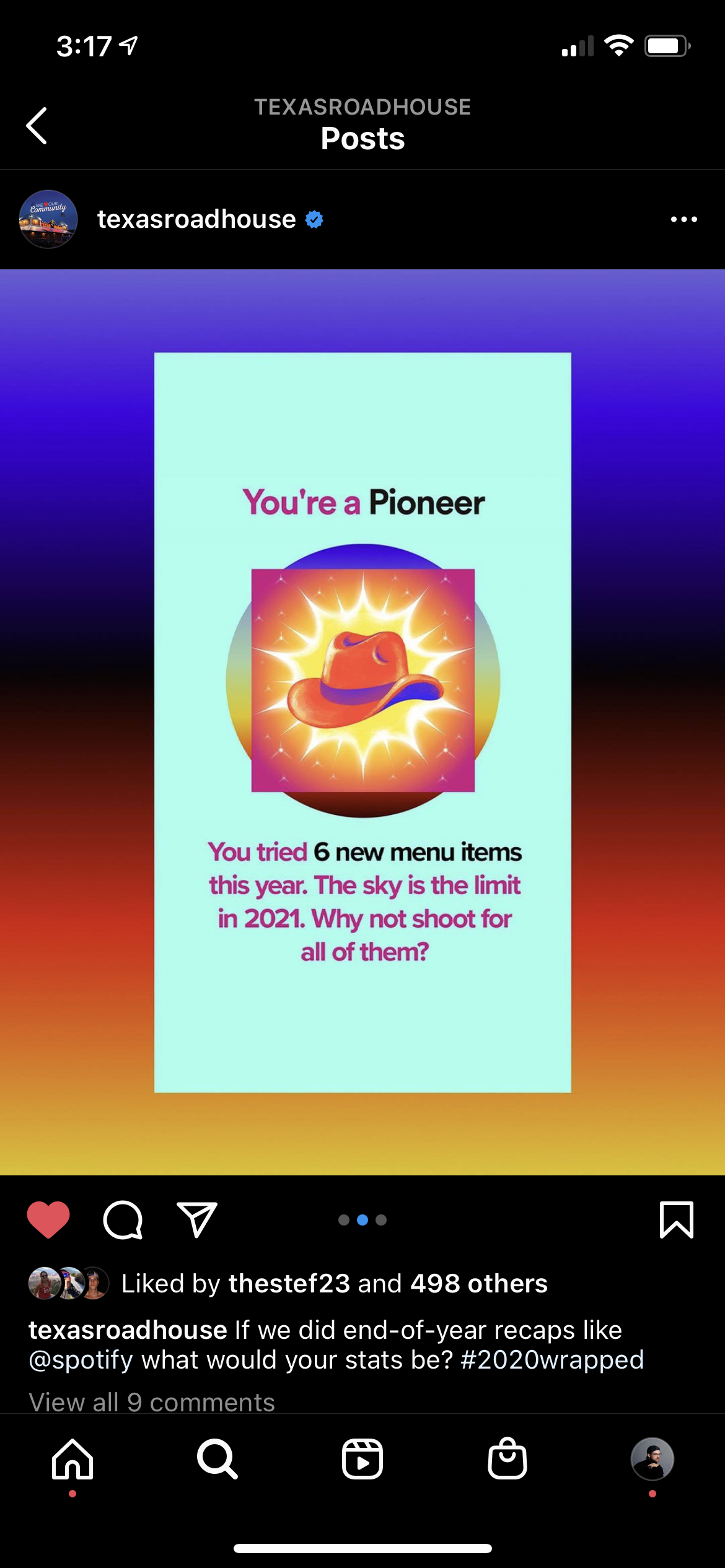 We launched a paid social media campaign to walk customers through – and drive them to – completing to-go orders online. Just eating the food doesn’t do the Texas Roadhouse experience justice so we used Pinterest to reveal the brand’s top-secret cocktail recipes for customers to recreate at home. We also curated and promoted a Jukebox Jams Spotify playlist so our customers could listen to all the classic country hits they hear at the restaurant and bring the ambiance together.